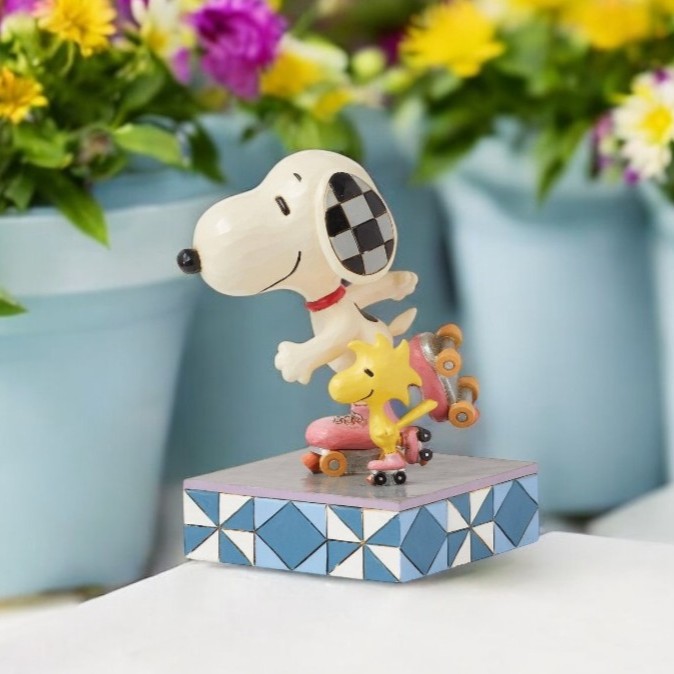 ウッドストックと仲良くローラースケートを楽しむスヌーピーのフィギュア。