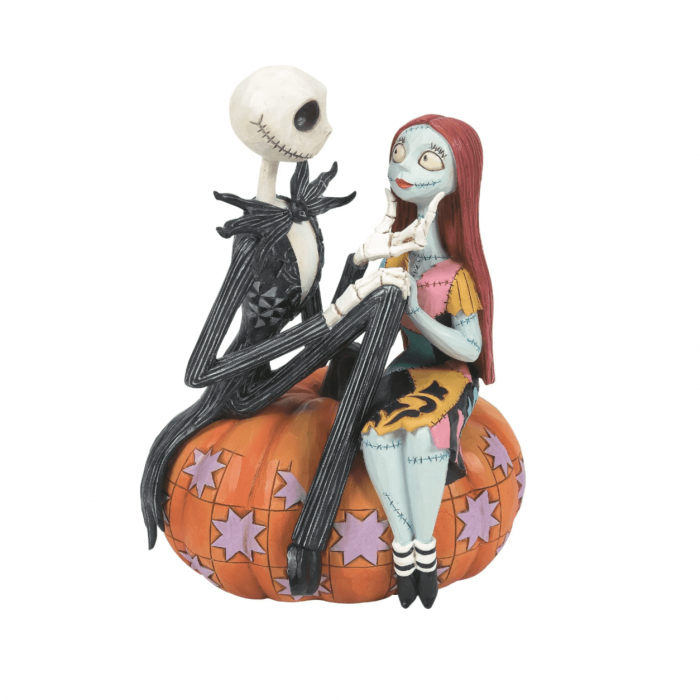 ジャックがサリーの頬に手を添えて大きなカボチャの上で見つめ合ってます。